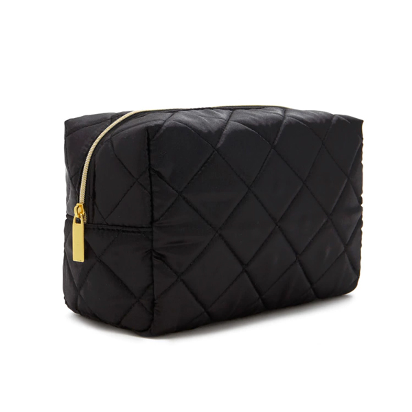 A soft makeup bag featuring a quilted design, high polish zipper top, and pullout sides for a compact look.